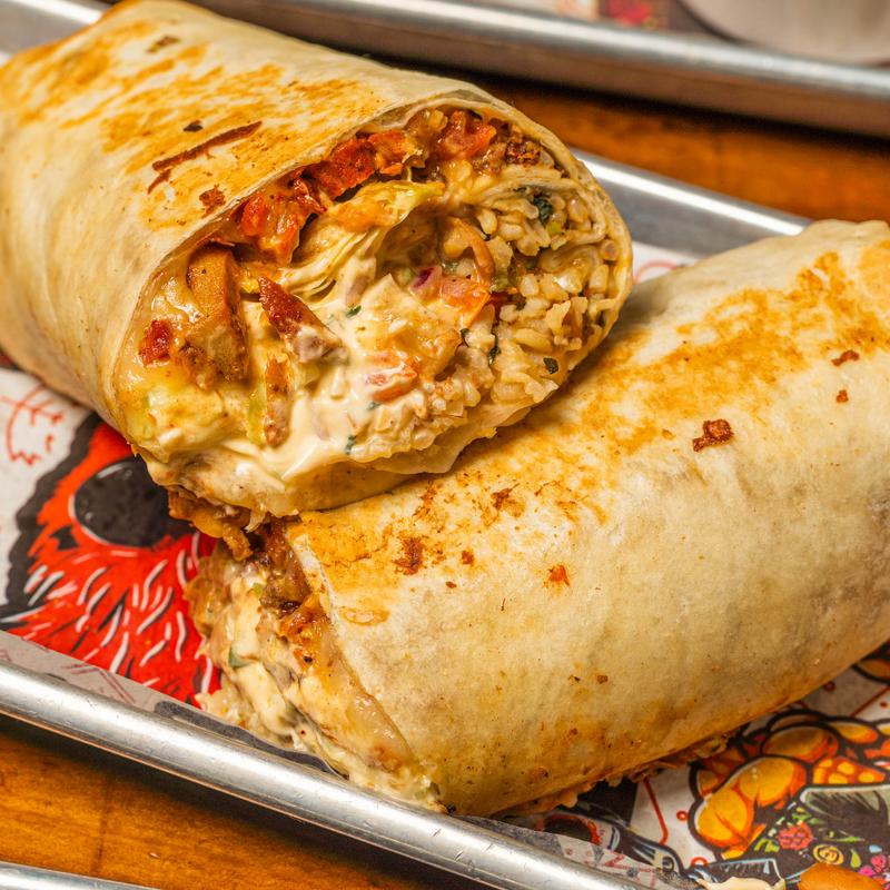 XL 14-inch flour tortilla stuffed with your choice OF protein, Chihuahua cheese, cilantro lime rice, beans, pico, guacamole, and crema.