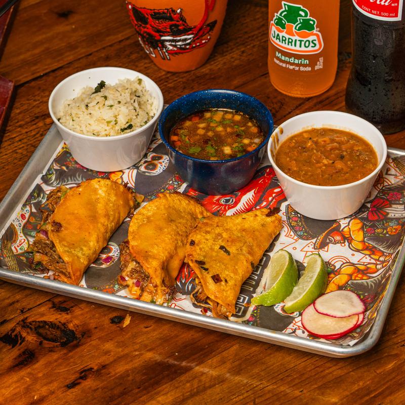 Three quesabirria tacos, consommé, cilantro lime rice, and charro beans.