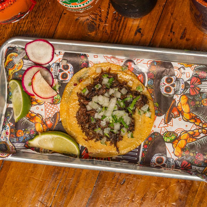 A 6-inch flour tortilla stuffed with Chihuahua cheese and your choice of meat: Gringa (al pastor), Pirata (carne asada), or Campechana (al pastor + carne asada).